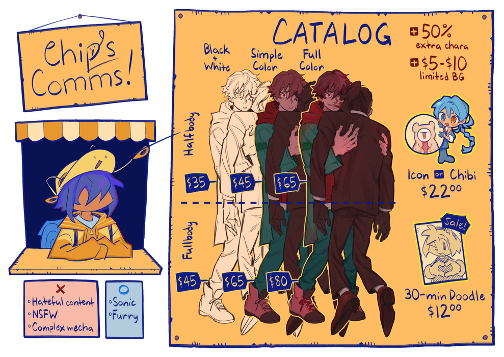 ● Keep in mind that I have school; commissions are usually updated during weekends and may be delayed depending on weight of coursework● I will send progress images during the sketch, line art, and flat color stages of every type of commission except the 30 minute doodles● 30 Minute Doodles: I will time myself for 30 minutes and whatever I finish is the final product (don't worry I draw relatively fast); For every extra character I add 15 minutes to the timer● Feel free to send reference images or concept drawings that will help me visualize what you want; the more specific the better● If you have read and agree to these conditions tell me your favorite snack in DMs :3